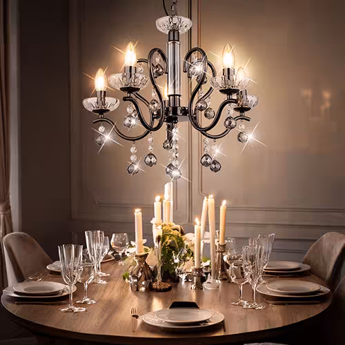 - Cristal : Pour des accents étincelants. Les lustres en cristal reflètent la lumière et créent une ambiance luxueuse.