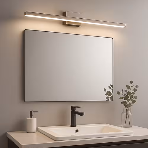 Grâce à leur forme plate, les lampes à miroir LED s'intègrent de manière élégante et peu encombrante - que ce soit directement sur le miroir, sur le mur ou dans un meuble. Leur design minimaliste s'intègre parfaitement dans les salles de bains modernes.