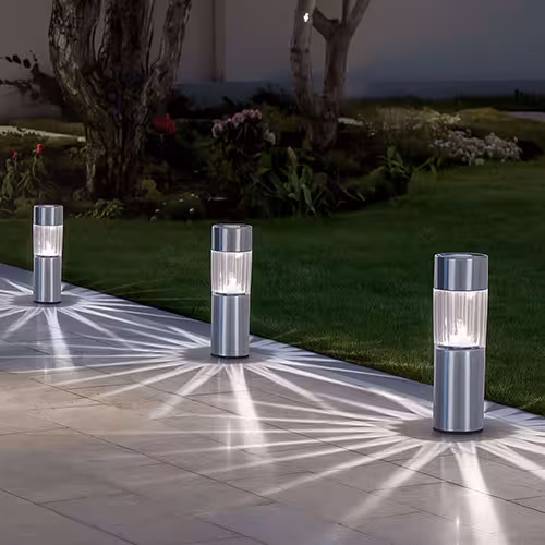Ces lampes solaires particulièrement compactes peuvent être placées de manière flexible dans le sol grâce à un piquet de terre. Elles conviennent bien pour des utilisations temporaires, des chemins étroits ou comme points lumineux décoratifs dans un parterre de fleurs.