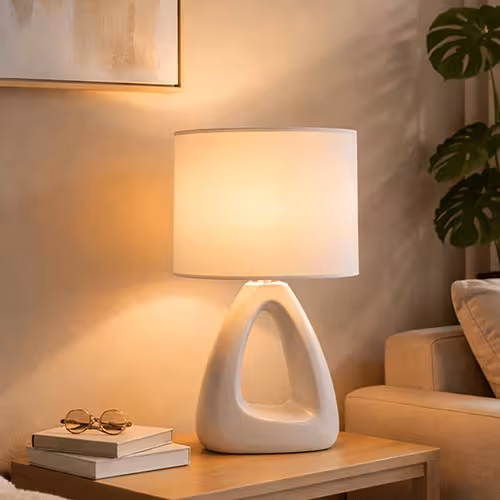 Lampe de table LED, variateur d'intensité tactile, horloge, date, CCT, H 31,4 cmDelai de livraison 3-6 jours ouvrables- Lampe de table, céramique blanche, abat-jour en tissu, H 38,5 cmDelai de livraison 1-3 jours ouvrables